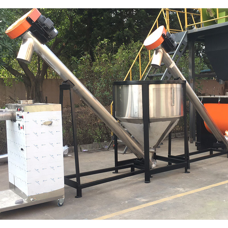 將PET塑料瓶料輸送至脫標機入料口,脫標機身前部有一段螺旋推送,將......